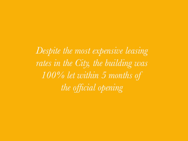 I produced numerous marketing and building launch materials including a leasing book, tenant microsite, and exhibition design. Despite the most expensive leasing rates in the city, the iconic building was fully let within 5 months of completion.